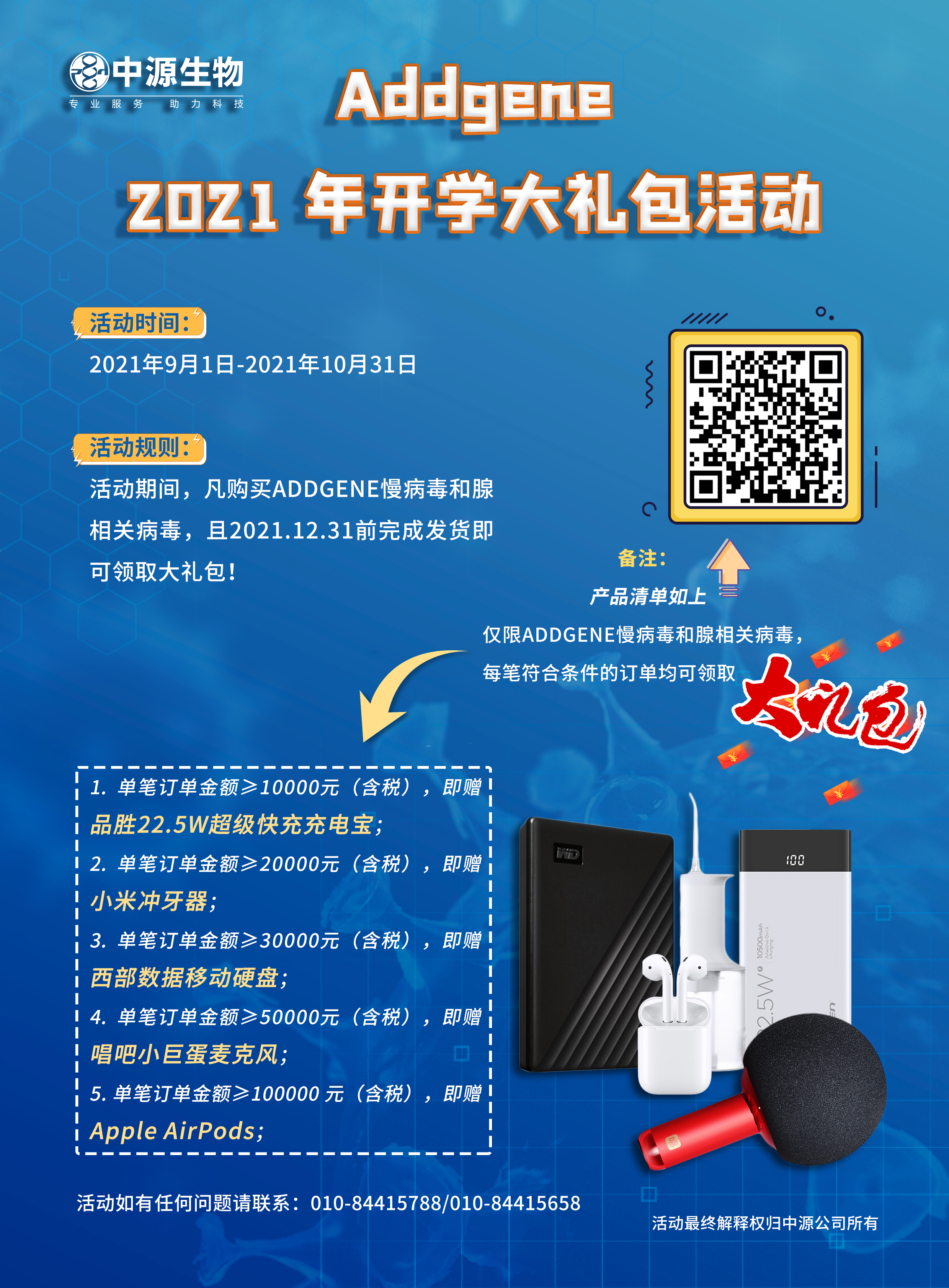 又到一年开学季 Addgene送福利啦! 凡购买病毒产品 满额即获赠相应礼品 过期不候哦! 2021-09-01 10:30:00.0