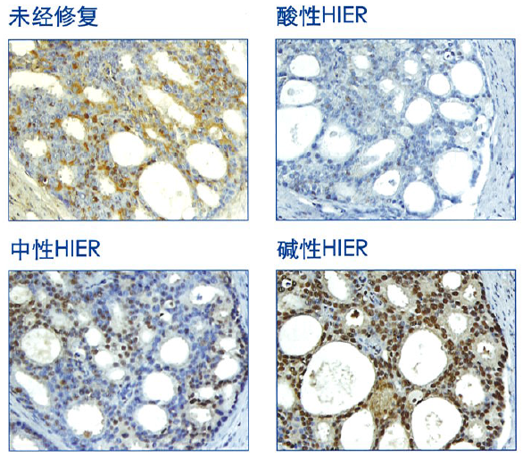 目前有多种技术可恢复表位的免疫反应性。简单的方法有改变抗体稀释液的ρH或阳离子浓度,这可能影响抗体与表位的亲和力。对于部分掩盖的表位,在开始抗原修复之前可以先试试改变一抗的孵育条件。不过,这一步也需要抗体浓度、孵育时间和温度的进一步优化。在讨论抗体修复方法时,技术通常分为两大类,蛋白酶诱导的表位修复(PIER)和热诱导的表位修复(HIER)。一旦优化好,抗原修复的影响可以是明显的。