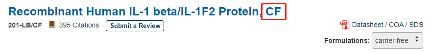 CF,是 Carrier Free 的意思。一般来说,为了对重组蛋白的结构及活性进行保护,我们会在蛋白产品中添加牛血清白蛋白(BSA)作为载体蛋白。但考虑到 BSA 会对某些实验造成影响,我们又研发出不含载体蛋白(BSA)的产品,即 Carrier Free 蛋白。
