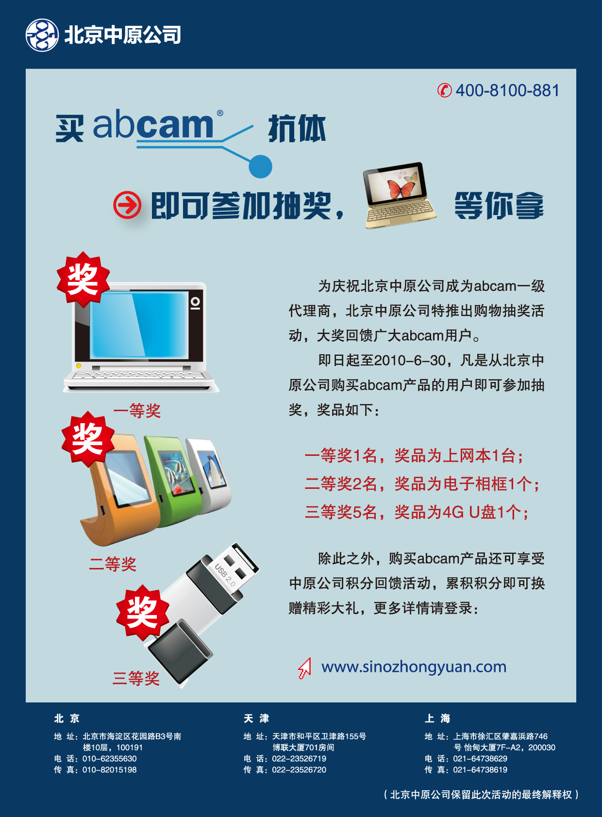 In celebration of Beijing Zhongyuan becoming Abcam’s primary agent in China, we had the luck draw to reward our customers. The list of winners is as fowllows: