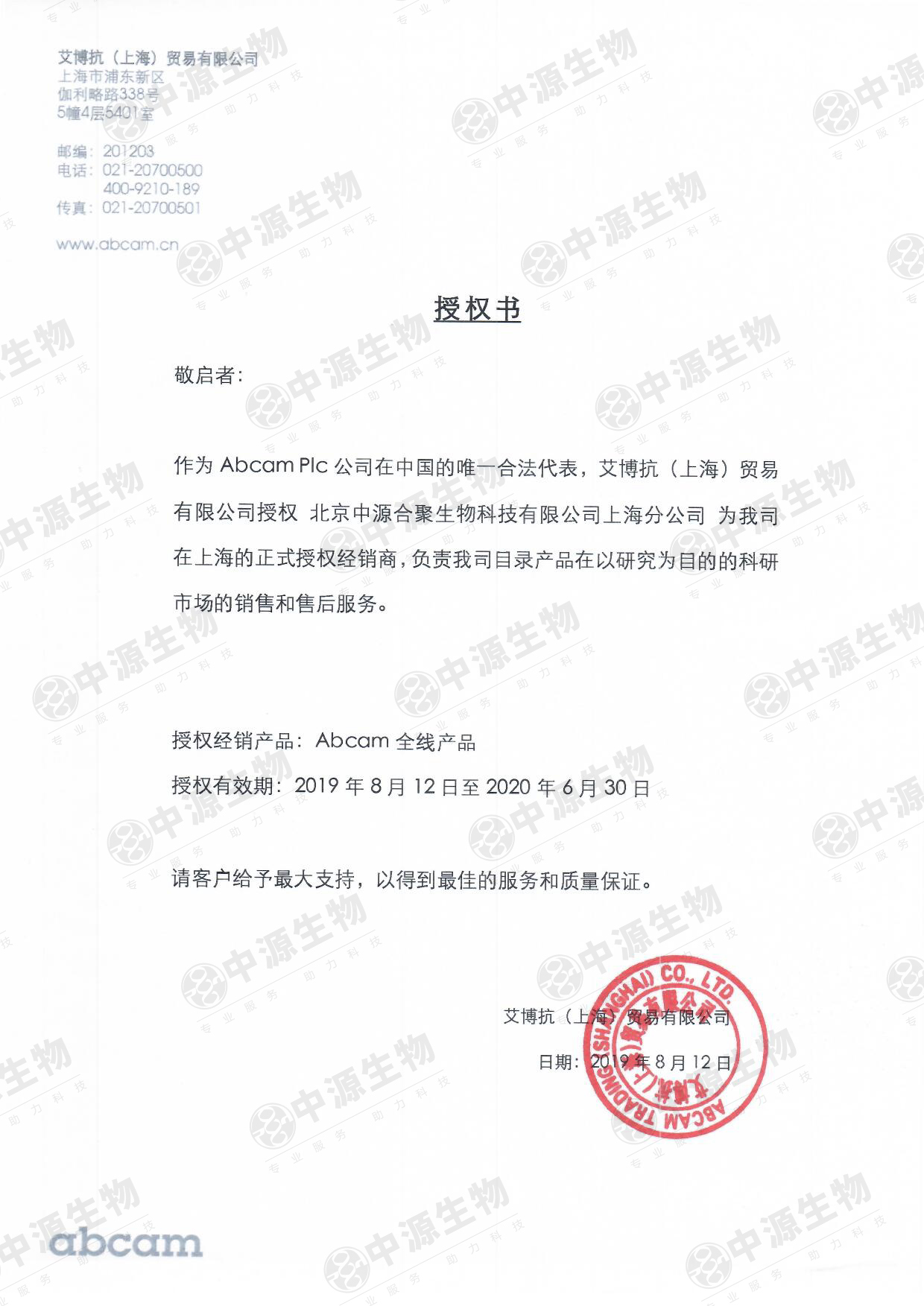 近年来,随着合作的不断加深,2019年8月起,米兰(中国)在原代理区域(北京、天津、内蒙古、青海、西藏、宁夏)的基础上新增了Abcam上海地区代理权,我们将一直秉承“专业服务,助力科技”的宗旨,一如既往的为客户带来优质的产品和更好的服务。