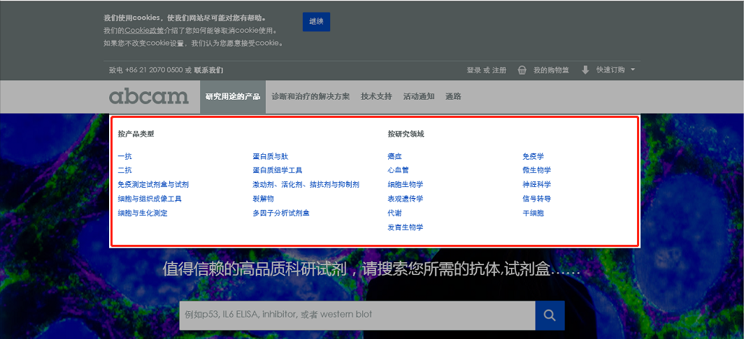 研究领域包括干细胞,神经生物学,染色质及核信号,心血管,信号转导,细胞生物学,肿瘤,免疫学,发育生物学,微生物学等。公司官网(www.abcam.cn)上有齐全的在线电子目录,您在数秒内就能找到所需产品。网站独有的体系,让您得到的不仅仅是抗体,还有更多服务: